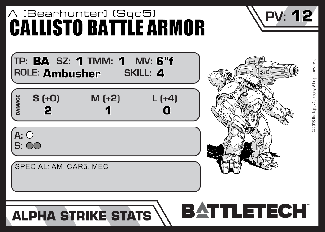 | Callisto Battle Armor A [Bearhunter] (Sqd6) | 380 | 12 | Standard | RG31 | |