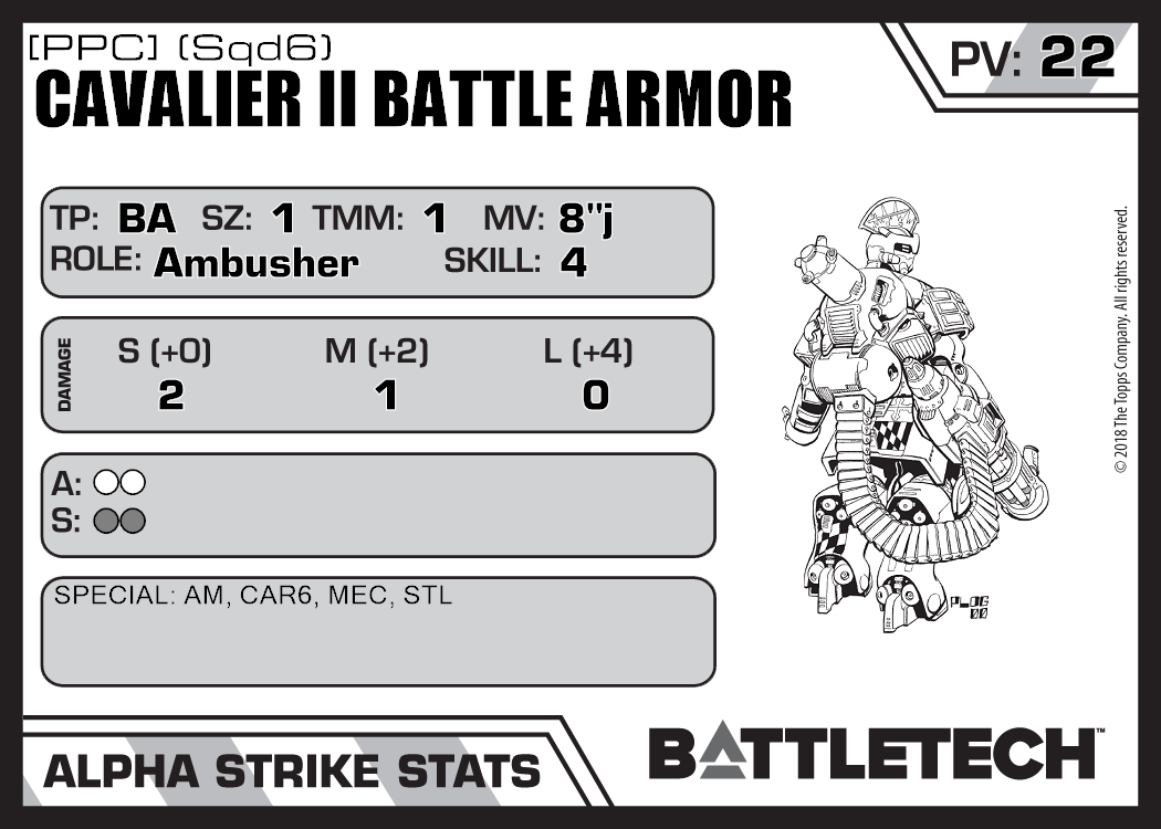 | Cavalier II Battle Armor [PPC] (Sqd5) | 395 | 21 | Standard | TR:3150 | |
